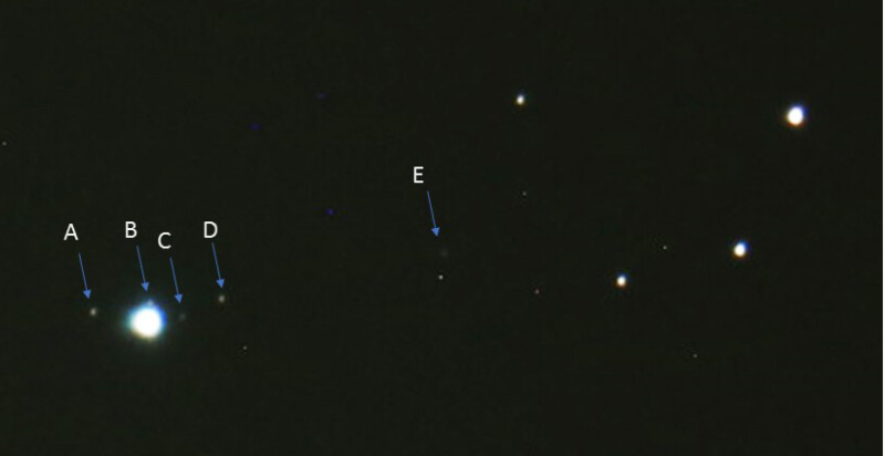 Uranus opgenomen op 2 Maart 2021, met inzoomen zijn 4 maantjes zichtbaar: A= Titania, B= Ariel, C= Umbriel en D= Oberon.